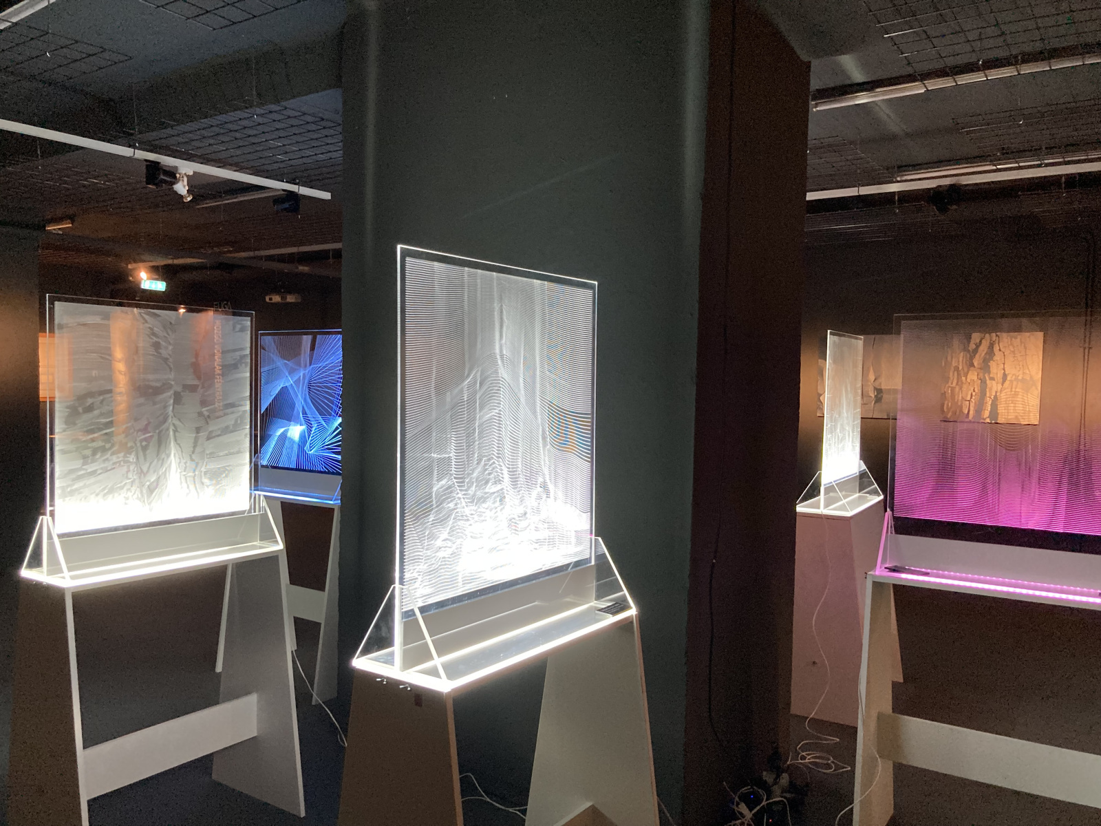 Az installáció használatának kötöttségei miatt a fényrajzok terveit gyakran falra akasztható, bekeretezett formában is elkészítem. Ilyenkor leginkább fluoreszcens zöld lemez két oldalára kerül a gravírozás, majd a jobb hatás érdekében fekete hátteret használok. A kiállított képek között láthatóak olyanok is, amelyek esetén a leghátsó réteg a gravírozott rajzok nyomtatott variációja.